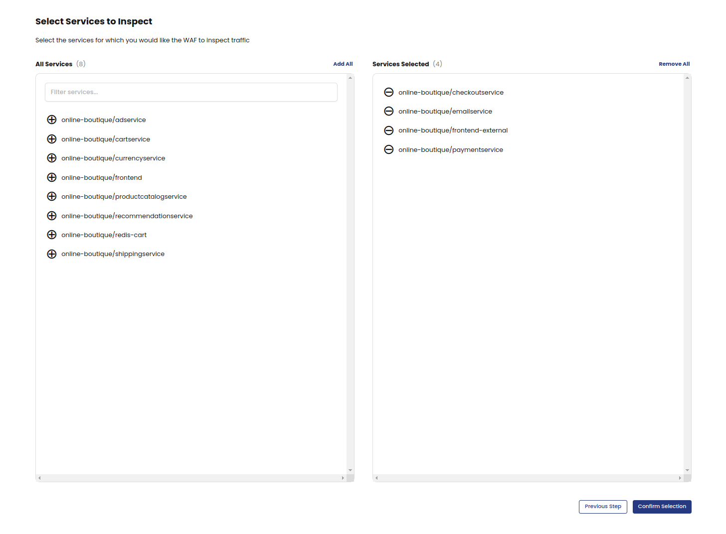 Select the deployments you want WAF to inspect, and then click Confirm Selections.